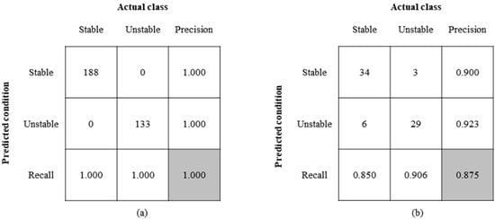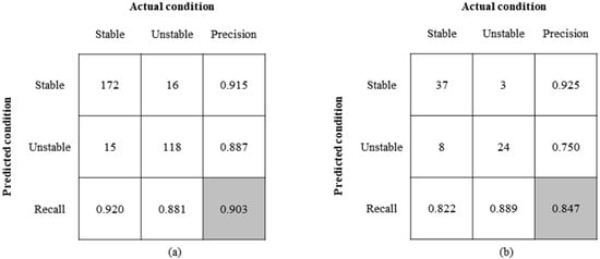 Figure 9 summarizes the confusion matrix obtained from the LR model. For the training data, the accuracy and recall rates of the two conditions (stable and unstable) were 0.903, 0.920, and 0.881, respectively. For the testing data, the accuracy was 0.847 and the recall rates for the two conditions were 0.822 and 0.889, respectively. Eight stable conditions were mistakenly identified as unstable, and three unstable conditions were incorrectly predicted as stable. In general, the performance of the LR model was similar to that of the SVM model, and the XGBoost model outperformed the other three models.