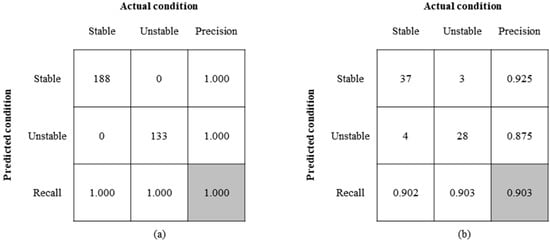 Figure 8 shows the confusion matrix of the XGBoost model. For the training data, the accuracy, recall rate, and precision of the two conditions were all 1.000. All stable and unstable conditions were correctly identified, as in the RF model. For the testing data, the accuracy was 0.903, and the recall rates for the two conditions were 0.902 and 0903, respectively. Four stable conditions were mistakenly identified as unstable, and three unstable conditions were incorrectly predicted as stable. It can be observed that the performance of the XGBoost model was better than that of the RF and SVM models.
