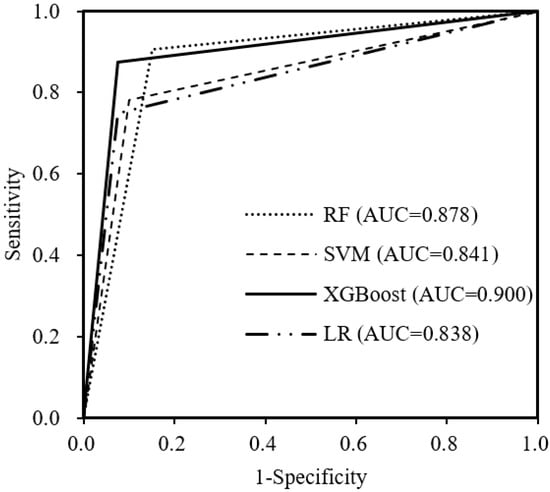 The AUC scores of the four ML models are shown in Figure 10. It can be seen that the AUC value of the testing dataset for XGBoost is 0.900, which could be considered to indicate excellent classification performance (AUC > 0.9), followed by RF (AUC = 0.878), SVM (AUC = 0.841), and LR (AUC = 0.838).