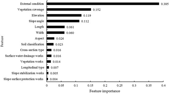 Feature importance analysis was performed to investigate the role of each feature. Feature importance is an important reference for feature selection and model interpretability. A trained XGBoost-based model can automatically calculate the feature importance, which can be obtained through the interface feature importance criterion, that is, the gain criterion. The gain is calculated by taking each feature’s contribution to each tree in the model; the higher the relative importance of the feature, the more the feature contributes to the model [50]. The importance of the 14 features in the XGBoost model is ranked in Figure 11. The external condition and vegetation coverage were the most important variables, with importance values of 38.5% and 15.2%, respectively, followed by elevation (11.9%), slope angle (11.2%), length (6.1%), and width (6.0%). This result provides an important reference for exploring the stability evolution of landslides and provides multisource monitoring data for slope restoration.