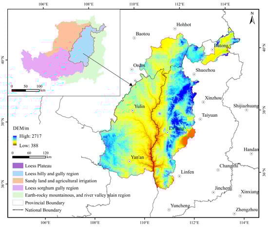 The Loess Plateau, covering an area of 640,000 km2, is within the continental monsoon region. It is divided into four ecological regions [18], and this study focuses on the loess hilly and gully region shown in Figure 2 (107°43′ E–114°50′ E, 35°03′ N–41°09′ N), which has a total area of 129,000 km2. The annual average precipitation (1998–2019) is 455 mm and the annual average temperature is 7.2 °C. The terrain is hilly in the southeast and low-lying in the northwest, with an average elevation of 388–2717 m. The topography is complex, with dominant hills and mountains.