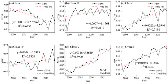 Based on relevant studies, the NDVI value was divided into classes I to V with the values varying between 0–0.2, 0.2–0.4, 0.4–0.6, 0.6–0.8, and 0.8–1, respectively [29]. The mean NDVI value for class I in the study area (Figure 4a) was 0.172, showing a highly significant (p < 0.01) decreasing trend at a rate of 0.0012/year. The mean NDVI values of class II (Figure 4b) and class IV (Figure 4d) showed a significant (p < 0.05) increasing trend, with the rates of 0.0007/year and 0.0004/year, respectively. In contrast, the mean NDVI values of class III (Figure 4c) and class V (Figure 4e) showed extremely significant (p < 0.01) increasing trends, with the rates of 0.0020/year and 0.0031/year, respectively. Overall, as shown in Figure 4f, the mean NDVI showed a highly significant (p < 0.01) increasing trend with a rate of 0.0108/year, with a minimum of 0.3787 in 1999 and a maximum of 0.6567 in 2018. This indicates that the vegetation of the study area is improving.