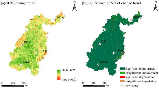 From 1998 to 2019, the NDVI trend in the study area ranged from −0.23 to 0.27 (Figure 7a), in which 98.56% showed a rising trend and only 1.44% showed a decreasing trend. The decreasing area was mainly located in areas such as Yulin, Yan’an, and Lvliang, which have seen relatively rapid urban development. According to the significance test (Figure 7b), the NDVI values were improved significantly in 95.14% of the area, and 3.42% were improved insignificantly. The vegetation cover near the major urban sites in the northwest and southeast showed significant or insignificant degradation, accounting for 0.84% and 0.4%, respectively, and the land use here mostly comprised construction sites and unused land. Overall, compared to the degraded area, the improved area was much larger.