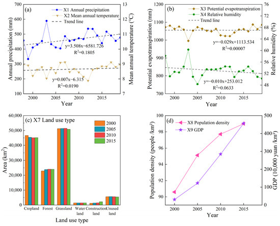 From 1998 to 2019, annual precipitation (X1) showed a significant increasing trend (p < 0.05) at a rate of 3.508 mm/year and mean annual temperature (X2) showed a non-significant increasing trend (p > 0.05) at a rate of 0.007 °C/year (Figure 9a). Both potential evapotranspiration (X3) and relative humidity (X4) showed a non-significant decreasing trend (p > 0.05) (Figure 9b). From 2000 to 2015, the area of cropland and unused land decreased by 1471 km2 and 168 km2, respectively, the area of forest land and construction land increased by 1083 km2 and 963 km2, respectively, and there were only slight changes in the grassland and water areas (X7, Figure 9c). Population density (X8) and GDP (X9) increased substantially (Figure 9d).