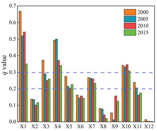 Factor detection can detect the explainability of NDVI by the potential influencing factors X. This was measured using the value of q varying between 0 and 1: