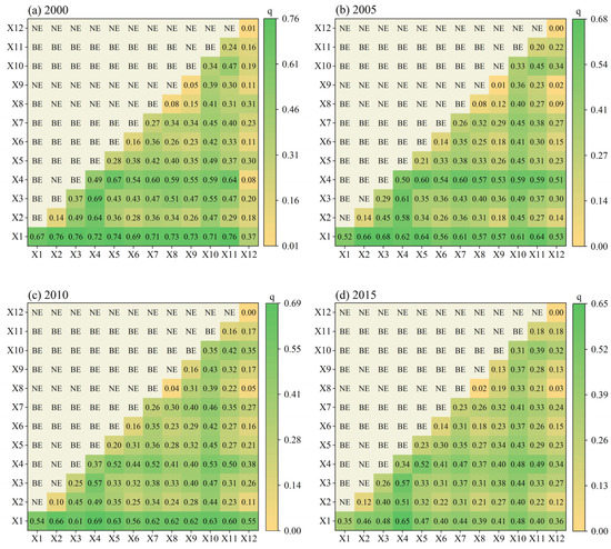 The ecological detection results for four typical years (p < 0.05), 2000, 2005, 2010, and 2015, were obtained based on the F-test (Figure 12). No significant differences were observed between annual precipitation (X1) or aspect (X12) and other factors, and there were significant differences between relative humidity (X4) and annual mean temperature (X2) or potential evapotranspiration (X3). No significant differences were observed between relative humidity and other factors. The relationships between slope (X6) and mean annual temperature (X2), GDP (X9) and mean annual temperature (X2), vegetation type (X10) and potential evapotranspiration (X3), land use type (X10) and elevation (X5), soil type (X11) and slope (X6), population density (X8) and GDP (X9), and GDP (X9) and soil type (X11) were significantly related only in some years.