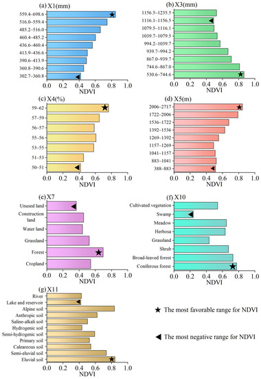Among the human factors, NDVI reached the maximum (0.696) when the land use type (Figure 13e) was forest land, followed by 0.542 when it was cropland, and the minimum value of 0.364 was reached when the land use type was unused land.