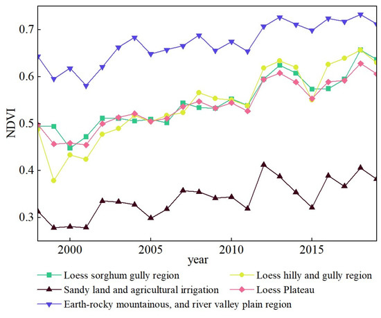 NDVI values of each ecological partition of the Loess Plateau from 1998 to 2019.