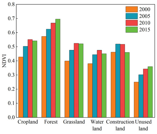 The mean NDVI values of different land use types for four typical years, 2000, 2005 2010, and 2015, are shown in Figure 16. Forest had the highest NDVI value with a mean value of 0.64, followed by cropland with a mean value of 0.51, and the smallest NDVI value was unused land with a mean value of 0.31. The NDVI values of cropland, forest, grassland, and unused land all showed an increasing trend from 2000 to 2015.