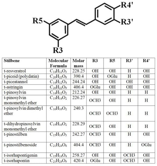 Species of the family Pinaceae synthesize a wide range of stilbenes such as pinosylvin, pinosylvin monomethyl ether, pinosylvin dimethyl ether, piceid, and resveratrol (Figure 1 and Table S1). It is interesting to note that different species of the Pinaceae family are characterized by different stilbene composition. For example, the genus Pinus is characterized by the presence of a large amount of pinostilbene and its glycosylated form or pinosylvin and methyl-pinosylvin (Figure 1 and Table S1) [,,,,,,,]. On the contrary, species of the genus Picea are characterized by the presence of high amounts of t-astringin and t-isorapontin (Figure 1 and Table S2) [,].