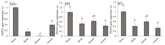 The expression of PkSTS genes ((a)—PkSTS1; (b)—PkSTS2; (c)—PkSTS3) in the Pinus koraiensis that have been collected in the winter, spring, summer, and autumn. The means in each column followed by the same letter did not differ when using one-way analysis of variance (ANOVA) with Tukey’s pairwise comparisons.