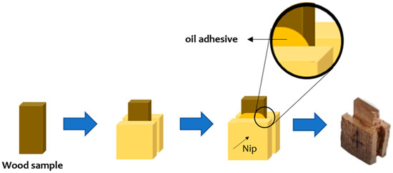 A total of six groups of samples with untreated, CPL-treated and FA-CPL-co-treated earlywood and latewood were processed into 5 × 1 × 10 mm (width × thickness × length) slices. In order to ease the SEM sample preparation, two 5 × 1 × 5 mm (width × thickness × length) wood chips were used to clamp the slices through an adhesive, as illustrated in Figure 1.