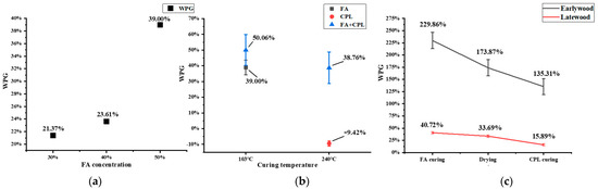 (a) Comparison of WPG of FA-modified wood with different concentrations, (b) Comparison of WPG of wood blocks under different processes. (c) Comparison of WPG of earlywood and latewood under the same process.