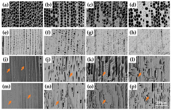 SEM images of the cross sections of earlywood (a) untreated; (b) treated with FA; (c) treated with CPL; (d) treated with FA and CPL and latewood (e) untreated; (f) treated with FA; (g) treated with CPL; (h) treated with FA and CPL. Radial sections of earlywood (i) untreated; (j) treated with FA; (k) treated with CPL; (l) treated with FA and CPL as well as latewood (m) untreated; (n) treated with FA; (o) treated with CPL; (p) treated with FA and CPL.