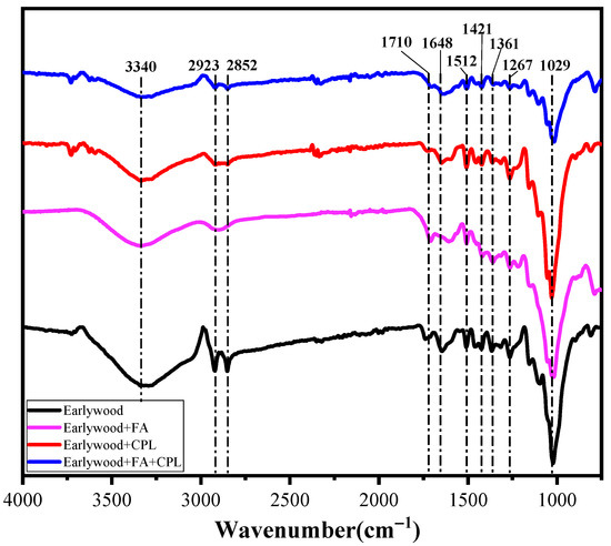 The infrared spectra of earlywood before and after modification are shown in Figure 4. In this study, only the infrared spectra of the earlywood were analyzed because there was no significant difference between the earlywood and latewood. The characteristic infrared peaks as well as their attributions are summarized in Table 2. There is a broad peak at 3340 cm−1, which is ascribed to free hydroxyl or N-H stretching vibration, and its intensity decreases gradually with the increase in modification degree (from mono-component to combinational components). It can be concluded that the peak is mainly attributed to the free hydroxyl rather than N-H stretching vibration, since the peak intensity actually decreases after CPL or FA-CPL co-treatment. The decrease in the free hydroxyl group in the modified wood overwhelmed the impact of the increase in N-H stretching vibration caused by the increase in the amount of CPL added. The absorption peaks of 2923 cm−1 and 2852 cm−1 are ascribed to methylene and methyne, respectively. The intensity reduction of these two peaks was due to the partial degradation of hemicellulose by heat during the curing process [19]. At 1706 cm−1, with the increase in modification degree, the characteristic peak of the carboxyl group gradually decreased, which might be due to the reaction between the amino group and carboxyl group upon CPL ring opening [20]. Due to the cross-linking reaction with FA/CPL, the characteristic peaks of lignin at 1510 cm−1, 1423 cm−1, and 1267 cm−1 decreased [21]. Compared with unmodified samples, the peak intensities attributed to C-O and C-N of CPL-modified wood samples increased at 1029 cm−1, indicating that CPL penetrated the wood cells, because the peak intensity was still the largest despite the significant degradation of hemicellulose at the CPL curing temperature (i.e., 240 °C). Nevertheless, the peak intensity at 1029 cm−1 for FA-CPL-co-treated samples was the lowest. The reason for this was that the mass fraction of CPL in the impregnation solution was low, the carboxyl group produced by FA curing was substituted with CPL during the curing process, and the hemicellulose was significantly degraded at the CPL curing temperature, leading to a decrease in peak intensity.