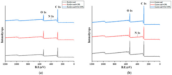 The elemental composition and chemical bonding determination of the sample surface were analyzed through X-ray photoelectron spectroscopy. It is worth noting that the spectra of the furfurylated group were not evaluated. The survey spectra of the earlywood and latewood with different treatments are shown in Figure 5. There are two intense peaks, C 1s and O 1s, representing the carbon and oxygen elements in the sample, respectively. The main elements of wood are carbon, hydrogen, and oxygen, while the modifier CPL contains a small amount of nitrogen. Since XPS cannot characterize hydrogen, this experiment mainly characterizes carbon, nitrogen, and oxygen.