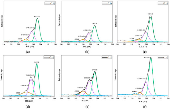 C 1s narrow spectrum of earlywood treated with different processes. (a) Untreated earlywood; (b) CPL-modified earlywood; (c) FA + CPL-modified earlywood. C 1s narrow spectrum of latewood treated with different processes. (d) Untreated latewood; (e) CPL-modified latewood; (f) FA + CPL modified-latewood.