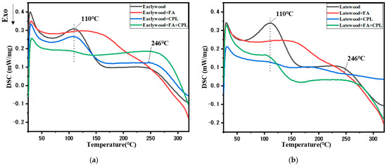 The thermal dynamic properties of latewood are slightly different from those of earlywood, as shown in Figure 8b. The wood samples modified with CPL had the lowest endothermic peak at 110 °C, indicating that the hygroscopicity of modified specimens decreased under CPL treatment. Similarly, after CPL modification, the sample also had a weak melting absorption peak at 246 °C. It is worth noting that the DSC curve of the CPL modified latewood was the flattest, which was different from that of earlywood. In contrast, for the FA-CPL-co-treated latewood, an endothermic and an exothermic peak were located at 110 °C and around 160 °C, respectively, further proving that FA-CPL had difficulties penetrating the cell walls due to the size limit of the internal channels.