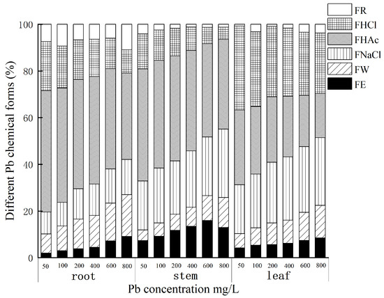 Fresh roots, stems, and leaves were washed with distilled water and homogenized with quartz sand and extraction buffer (250 mM sucrose, 1.0 mM dithioerythritol, and 50 mM Tris-HCl adjusted to pH 7.5). Subcellular fractions of Pb in roots, stems, and leaves were separated by centrifugation as follows: the cell wall fraction was separated to the bottom at 2000× g for 1 min; the supernatant solution was further centrifuged at 10,000× g for 30 min to obtain an organelle fraction in precipitate. The soluble fraction remained in the supernatant solution. All procedures were performed at 4 °C. The chemical forms of Pb were extracted following the method reported in [27]. Pb chemical forms were extracted through the following steps: (1) inorganic forms were extracted using 80% ethanol; (2) organic forms were extracted using H2O; (3) pectates and protein forms were extracted using 0.6 mol·L−1 NaCl; (4) undissolved phosphate forms were extracted using 2% HAc; (5) oxalate forms were extracted using 0.6 mol·L−1 HCl; and finally, (6) the residual Pb form was left. The contents of Pb in different subcellular fractions were quantified by AAS.