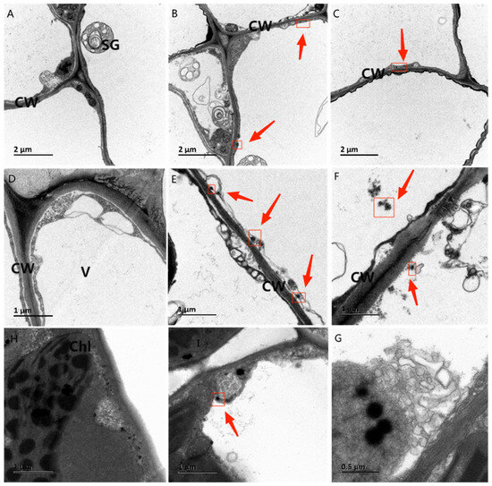 Effect of Pb on the microstructure of P. fortunei. Note: CW = cell wall, SG = starch granule, V = vacuole, and Chl = chloroplast. Red arrows point out heavy metal particles. (A,D,H) are the root, stem, and leaves, respectively, of P. fortunei in the control group; (B,E,I) are the root, stem, and leaves, respectively, of P. fortunei under 400 mg L−1 of Pb; (C,F,G) are the root, stem, and leaves, respectively, of P. fortunei under 800 mg L−1 of Pb.