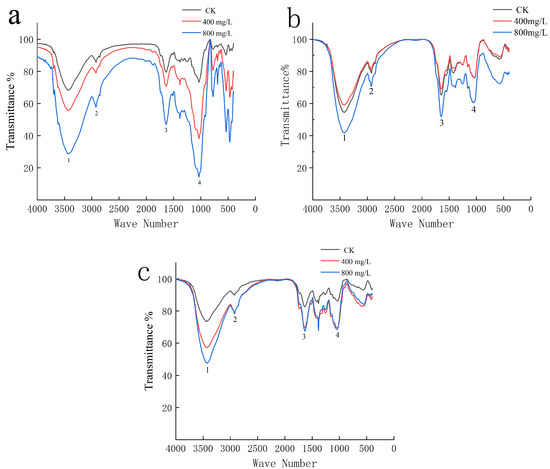 Effect of Pb on functional group of P. fortunei. Note: (a–c) correspond to the root, stem, and leaves of P. fortunei, respectively. (1–4) indicate the absorption peaks near 3420 cm−1, 2920 cm−1, 1630 cm−1, and 1040 cm−1, respectively.