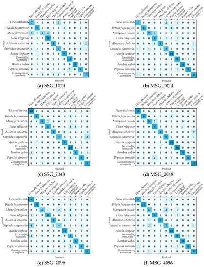 As mentioned earlier, there are noticeable inconsistencies in point cloud quantity and density acquired from ALS data. Considering PointNet++’s requirements for training data, the classification performance after down-sampling to 512 points is not satisfactory. Therefore, this study opted to enhance point clouds with fewer points for certain tree species. In order to maintain the geometric structure and semantic information of the point cloud, we employ point cloud jittering to augment the point cloud data to meet the down-sampling requirements [51]. Specifically, we randomly selected some points from the point cloud data and added random numbers sampled from a normal distribution with a mean of 0 and a standard deviation of 0.01 to the three-dimensional coordinates of these points. The transformed point cloud was then merged with the original point cloud to generate new point cloud data. This process was repeated until the number of points in the point cloud met the preset value. In point cloud deep learning models, the input of different sample points has varying impacts on the model’s accuracy. In order to investigate the influence of sample points on classification accuracy, we utilized both SSG and MSG classification methods for the augmented point cloud data, and classified after down-sampling to 1024, 2048, 4096, and 8192 points, respectively. The number of epochs was set to 200, and the batch size was set to 16. The confusion matrix results of the classification outcomes are shown in the following Figure 5.