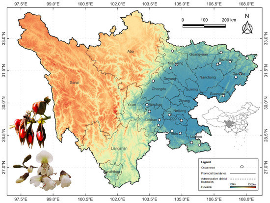 The distribution data of O. hosiei in Sichuan were acquired from literature records, online specimen databases, and field investigations. The online databases mainly included the Chinese National Museum of Natural History (http://www.cfh.ac.cn/, accessed on 3 December 2022), Chinese Virtual Herbarium (http://www.cvh.org.cn/, accessed on 4 December 2022), National Specimen Platform (http://www.nsii.org.cn, accessed on 7 December 2022), and Teaching Specimen Resource Sharing Platform (http://mnh.scu.edu.cn/, accessed on 11 November 2022). The distribution occurrences explicitly indicated at or below the county level were retained, and the others were deleted. Finally, 22 valid county-level distribution points were obtained, and the latitudes and longitudes were obtained from the coordinate acquisition system (http://aqsc.shmh.gov.cn/gis/getpoint.htm, accessed on 12 March 2023).