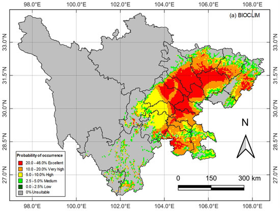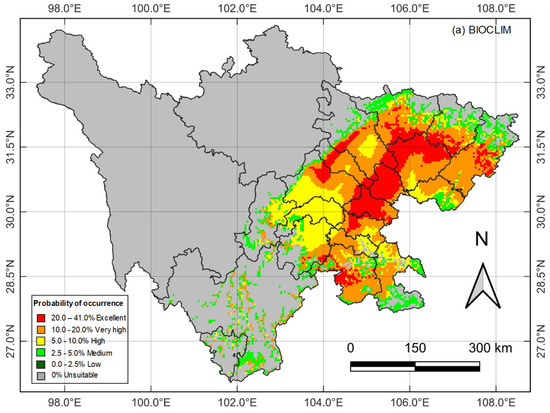 Both models predicted consistent outcomes for very high and excellent suitable habitats and the same species distribution concentration in the eastern Sichuan region. However, some differences in specific results at the local scale were generated. First, the DOMAIN and BIOCLM models output different values, producing classification confidence rather than species suitable habitat probability [15,39]. After obtaining this value, the suitable threshold needs to be customized according to the study’s actual situation. In this study, if the results of the suitable habitat classification were automatically assigned by DOMAIN, almost no excellent suitable habitat could be found in Sichuan (Table 3), which is inconsistent with actual investigations. Therefore, we suggested that it is unnecessary to be too harsh when analyzing the DOMAIN modeling results. Instead, the top two high and excellent classes can be considered together. Secondly, the two models’ algorithms are fundamentally different. BIOCLIM belongs to the “environmental envelope” type [42,43], which identifies and determines the locations where the environmental values occur within the range of measured values. Additionally, it uses the 5–95% probability envelope as the boundary to ignore the lowest and highest 5% of each climatic index to reduce the outliers’ impact on the prediction results [10]. DOMAIN derives a point-to-point similarity measure and assigns a value to the potential distribution point based on the degree of similarity between it and the most similar point in the environmental space. It then uses the sum of the standardized distances between the two points of each environmental prediction variable to quantify the similarity between two distribution points [15,44]. Therefore, judging from the prediction map, the excellent regional assignment of the DOMAIN model is significantly less than the BIOCLIM model (Figure 2).
