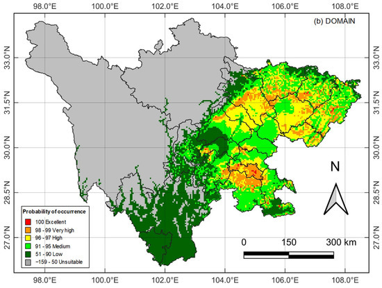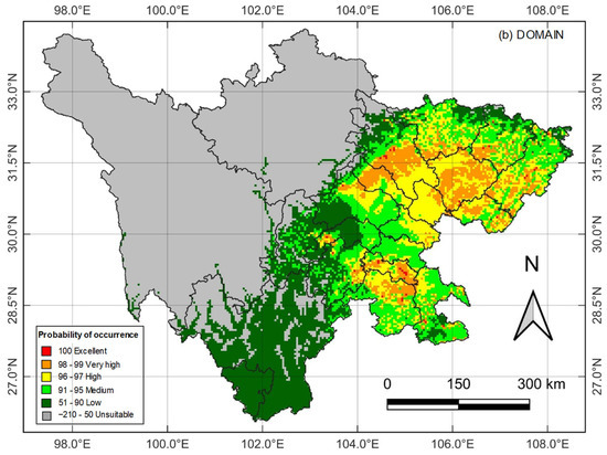 The suitable habitats were classified into excellent, very high, high, medium, low, and unsuitable and differentiated by color in DIVA-GIS 7.05 [17]. The two models differ notably in defining the suitable habitats’ class thresholds. BIOCLIM defines unsuitable to excellent as “Unsuitable”, 0%–2.5%, 2.5%–5.0%, 5.0%–10.0%, 10.0%–20.0%, and 20.0%–46.0%. DOMAIN uses the evaluation index to define the unsuitable to excellent classes as −210–50, 51–90, 91–95, 96–97, 98–99, and 100 based on [39].