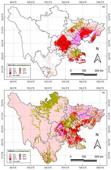 Distribution patterns of the limiting factors shaping the distribution areas of Ormosia hosiei generated by the (a) BIOCLIM model and (b) DOMAIN model. The selected six bioclimatic variables, shown in different colors, had the greatest impact on predicting suitable habitats in the distribution area. Refer to Table 1 for the meaning of the bioclimatic variables.