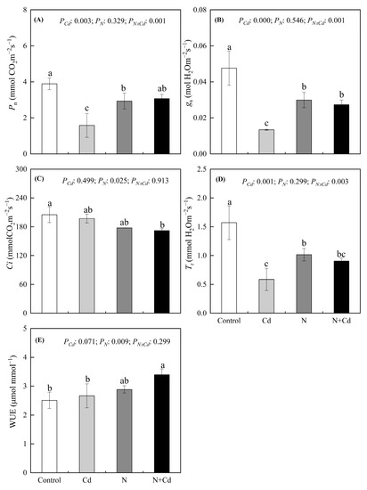 N addition altered the negative effects induced by Cd stress, which was reflected by a significant increase in Pn, gs and WUE. This indicated that N addition could mitigate the damage of the gas exchange system induced by Cd. N fertilization could have a positive effect on Pn, gs and Tr, which are positively related to plant yield [48]. Nitrogen supplementation helps stomatal opening, slightly restores the level of photosynthesis, improves the water use efficiency, and reduces stomatal limitations induced by Cd stress. These results indicate that N addition could help plants to increase their sensitivity to other stresses [49,50,51].