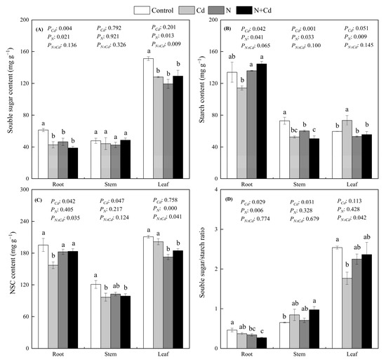 Effects of Cd and N addition on soluble sugars (A), starch (B), non-structural carbohydrate (C) and sugar/starch ratio (D) in roots, stems and leaves of E. glabripetalus. Different letters indicate significant differences between groups (mean ± SE, n = 3) (p < 0.05). PCd, Cd effect; PN, N effect; PN × Cd, the interactive effect of N and Cd.