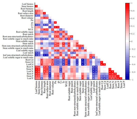 The leaf biomass and stem biomass were negatively correlated with leaf non-structural carbohydrate, leaf starch and root mean diameter, and positively correlated with N and P contents in plants. Root biomass was negatively correlated with root soluble sugar/starch ratio. Root length and root surface area were negatively correlated with leaf non-structural carbohydrate and root soluble sugar/starch ratio, and positively correlated with N contents in plants. Pn was positively correlated with non-structural carbohydrate in plants. Cd content in roots, stems and leaves was positively correlated with WUE, root biomass and root surface area, and negatively correlated with root soluble sugars and non-structural carbohydrates (Figure 5).