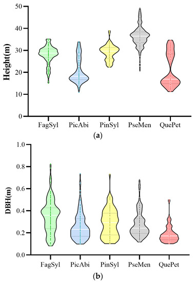 Distribution of tree heights and DBHs of the five tree species: (a) tree height distribution of different tree species; (b) DBH distribution of different tree species. In the figure, the white dotted line represents median, while the two black dotted lines represent 25 percentile and 75 percentile, respectively.