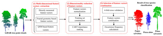 Although fusing LiDAR point clouds with other remote sensing data, such as hyperspecrtal image, can improve the performance of tree species classification, the fusion process is prone to error. Realizing the high-precision fusion of multi-source data is still a challenge. Thus, the classification of different tree species using LiDAR point clouds alone is still conducted by researchers. However, recognizing tree species from LiDAR point clouds still suffers from the following two problems. One is how to explore more effective features for tree species classification. The other one is how to obtain a combination of the feature vectors to achieve a higher classification accuracy, while reducing the feature vector dimension. To solve these challenges, this paper proposes a tree species classification method based on the combination of developed fractal geometry-based features and QSM-based features. In this method, three kinds of feature vectors were explored, including directly measured feature vectors, fractal geometry-based feature vectors and QSM-based feature vectors. In this paper, fifteen feature vectors in total were calculated. To reduce feature vector dimension, the classification and regression tree (CART) was adopted to analyze the importance of each feature vector. Among the fifteen feature vectors, ten important feature vectors were extracted for further analysis. Thereafter, to further reduce feature vector dimension, eight feature vectors with a high accuracy level and high occurrence frequency were extracted. The support vector machine (SVM) classification method was applied for tree species classification using the final eight extracted feature vectors. The experimental results show that the proposed method can obtain satisfying tree species classification results.