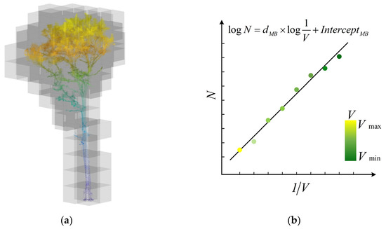 Fractal geometry parameters calculation using the box counting method: (a) tree points covered with a series of boxes; (b) a log–log linear regression using voxel size () and the number of voxels ().
