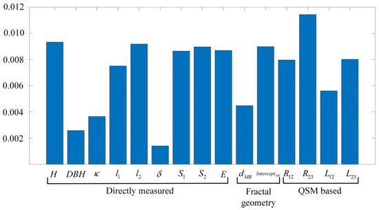 The relative importance of each vector calculated using the CART is shown in Figure 7. It can be found that although there are nine feature vectors involved in the directly measured feature vectors, three of them show a relatively low level of importance for tree species identification. These three feature vectors are DBH, the ratio () of DBH and H and the eccentricity () of canopy ellipse. In terms of fractal geometry-based feature vectors, is more important than is. From Figure 7, it is easy to see that all the four QSM-based feature vectors are functional in classifying tree species. Comparatively speaking, the relative importance of is lower than that of the other three QSM-based feature vectors. To reduce the feature vector dimension, five feature vectors with a low level of relative importance in these three kinds of feature vectors were ignored in the following SVM classification. These five feature vectors are , and DBH in the directly measured feature vectors, in the fractal geometry-based feature vectors and in the QSM-based feature vectors.