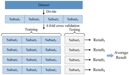 After dimensionality reduction, ten feature vectors were retained for further processing. To select the final combination of feature vectors, 4-fold cross validation was conducted via applying different combination of feature vectors with different dimensions. The 4-fold cross validation method is shown in Figure 8. The datasets were classified into four sets. Three sets were selected for training, while the remaining one was used for testing. The mean accuracy for the four results is given as the classification accuracies.