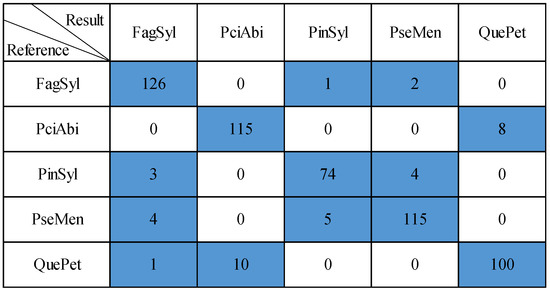 where is the number of trees correctly classified as the specific species, is the number of trees correctly classified as other species, is the number of trees misclassified as other species and is number of trees misclassified as the specific species by other species. The confusion matrix of the classification results in this paper is shown in Figure 10.