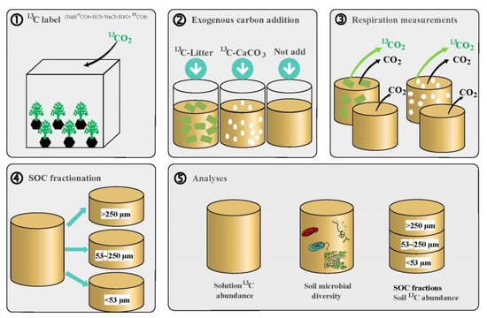 Labeled litter was obtained by labeling with 13C potted Koelreuteria paniculata (a major tree species in karst forests) seedlings over the period of August–October 2020 using the pulse-labeling method. Ten pots containing K. paniculate seedlings were placed in a special hermetically sealed Plexiglas growth chamber, into which 13CO2 produced by the reaction between NaH13CO3 and HCl (NaH13CO3 + HCl = NaCl + H2O + 13CO2) was injected periodically to allow 13C to become introduced into K. paniculate tissues through photosynthesis (Figure 1①). This procedure was performed every half-month. Each time, 5.0 g of NaH13CO3 and 0.1 M of HCl were injected into the chamber to allow them to react fully with each other, producing 1.31 L of 13CO2. Three months later, after 6 injections, K. paniculate stems and leaves were harvested. The collected samples were dried, crushed, and sieved through a 5 mm sieve to produce an enriched 13C_labeled litter for subsequent use. NaH13CO3 (cat number: IR-33294, enrichment: 99 atom%) and Ca13CO3 (cat number: IR-32318, enrichment: 98 atom%) which were to be applied directly to the soil were purchased from Shanghai ZZBio Co., Ltd., Shanghai, China.