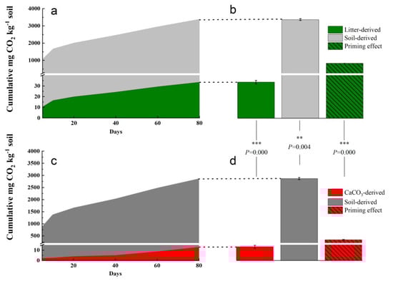 By analyzing 13CO2, we could differentiate between CO2 derived from the native SOC and CO2 derived from the exogenous compounds. In the 13C_litter amended soil, native-soil-derived CO2 (3360.79 mg CO2-C kg−1 Cbulk) and net litter-derived CO2 (33.52 mg CO2-C kg−1 Cbulk) were significantly higher than in the 13C_CaCO3 amended soil (native-soil-derived CO2: 2855.76 mg CO2-C kg−1 Cbulk; net CaCO3-derived CO2:13.04 mg CO2-C kg−1 Cbulk), with p < 0.01 and t = 6.003; p < 0.001 and t = 18.512, respectively (Figure 2a,b). Litter-derived CO2 only accounted for 0.99% of the total respiration in the 13C_litter treatment, and the CaCO3-derived CO2 for around 0.45% in the 13C_CaCO3 amended treatment. The 13C_litter addition induced a higher priming effect than 13C_CaCO3 addition (Figure 2c,d), accounting for a net release of 832.12 mg CO2-C kg−1 Cbulk from the native SOC compared to 327.09 mg CO2-C kg−1 Cbulk in the 13C-CaCO3 treatment (p < 0.001, t = 80.689).