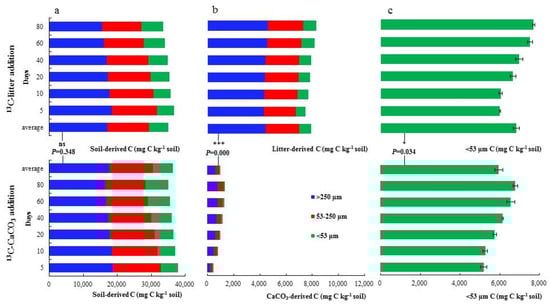 Allocation of soil-derived and litter-derived C to SOC fractions in 13C_litter and 13C_CaCO3 addition soils. Content of > 250 μm, 53~250 μm, and < 53 μm fraction C and in mg C kg−1 soil of (a) soil, (b) allothigene (13C_litter, 13C_CaCO3), and (c) all originate in different incubation periods of 13C_litter and 13C_CaCO3 addition soils (means, SDs displayed with errors bars, n = 3 independent replicates). Asterisks represent significant differences between the average values of different addition soils (*** p < 0.001, * 0.01 ≤ p < 0.05, ns p ≥ 0.05). Statistical significance was analyzed using an unpaired two-sided t-test.