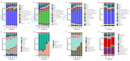 Characteristics of the soil microbial community composition at the genus level. (a,b) and (c) show the composition of the soil bacterial community in the CL (no addition of exogenous carbon), LL (13C_litter addition), and CCL (13C_CaCO3 addition) treatments at different stages of incubation, respectively. (d–f) show the composition of the soil fungal community in the CL (no addition of exogenous carbon), LL (13C_litter addition), and CCL (13C_CaCO3 addition) treatments at different stages of incubation, respectively. (g,h) show the composition of the bacterial and fungal communities in different treatments, respectively. The composition of each community with an abundance greater than 1% is shown in the figure, whereas the communities with an abundance less than or equal to 1% are classified as others (means, n = 3 independent replicates).