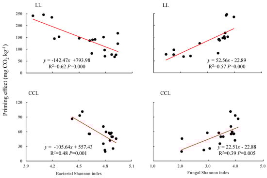 Correlation of soil microbial diversity with native soil carbon priming effect. LL is 13C_litter addition; CCL is 13C_CaCO3 addition. The two plots on the left show the linear regression models of bacterial diversity and the priming effect. The two plots on the right show the linear regression models of fungal diversity and the priming effect. The regression equations, R2, and differences are provided in the figure.