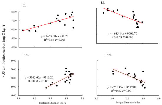 The effects of soil fungi on SOC priming significantly exceeded the effects of bacteria on SOC sequestration (R = 0.40 vs. 0.27, p = 0.003 vs. 0.02), leading to an increase in SOC mineralization and decomposition after the addition of exogenous C. This phenomenon was more pronounced in the LL treatment than CCL treatment. Sheng and Zhu [69] found that adding biochar to soil increased the diversity of soil bacterial communities, reduced CO2 emissions, and increased soil C sequestration. Gai et al. [70] found a decreasing trend in fungal diversity and an increased risk of soil C loss in a subtropical Lei bamboo (Phyllostachys praecox) forest after adding OM to the soil. Similarly, by examining red soil added with 13C_labeled CaCO3 and rice straw, Xiao et al. [30] found that fungal diversity was a crucial factor for SOC mineralization and that soil C sequestration was significantly and directly affected by bacterial diversity. The results of this study are in line with that finding (Figure 7).