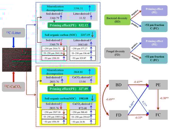 Main effects of 13C_litter and 13C_CaCO3 addition on organic carbon decomposition and stabilization in lime soil. BD: bacterial diversity, FD: fungal diversity, PE: priming effect, FC: C in <53 μm fraction. Short vertical blue and red arrows represent increases and decreases in soil C processes in response to 13C_litter and 13C_CaCO3 additions. Oblique blue and red arrows indicate positive and negative correlations, respectively. Numerical values correspond to results at day 80 of incubation. A path analysis of the direct and indirect effects of bacterial diversity and fungal diversity on the priming effect and C in the <53 μm fraction is presented. The width of the arrows indicates the strength of the standardized path coefficient. The blue lines indicate positive path coefficients, and the red lines indicate negative path coefficients. Asterisks represent significant differences between the average values (** 0.001 ≤ p < 0.01, * 0.01 ≤ p < 0.05). Statistical significance was analyzed using an unpaired two-sided t-test.