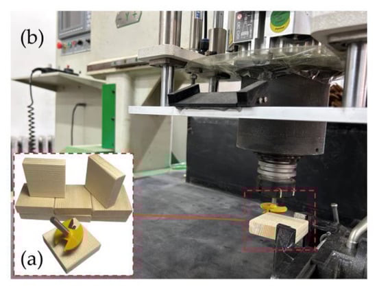 The type of milling cutter used was a 45° mortise and tenon cutter (Tenon Cutter, Yueqing Fuxin Hardware Tools Co., Ltd., Dongguan, China), and its processing thickness range was 10–17 mm. Dongguan, China), whose spindle speed range is 0–12,000 r/min and the feed speed range is 0–40 mm/s. Figure 1 shows the experiment material and machine tool, Figure 1a shows the experiment material, and Figure 1b shows the “Nanxing” MGK06 3-axis wood processing center.