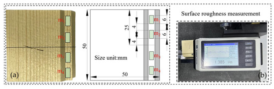 The measurement of wood surface roughness was performed using a digital display surface roughness measuring instrument (TIME3220, Beijing Times Raguang Technology Co., Ltd., Beijing, China) with a measurement range of 0–400 , a sensor tip radius of 5 , a resolution of 0.008 , a sampling length of 0.8 mm each time, and a corresponding probe movement speed of 0.5 mm/s. The surface roughness of the experimental wood block with smooth grain was measured according to the standard for measuring the surface roughness of wood (GB-T12472-1990). The measurement area is illustrated by the group No. 1 experiment as an example, and a schematic diagram of the surface roughness measurement area is shown in Figure 2. Figure 2a shows the surface roughness measurement area, and each group of experiments contains four areas, m1, m2, m3, and m4, respectively, and the dimensional parameters of each area can be seen in the figure. The depth of cut is the variable in the CCD experiment, so the width of the measurement area in each group of experiments is a variable value. According to GB-T12472-1990, the measurement of surface roughness should avoid wood knots, surface scratches, wood spurs, etc.; so the length of the measurement area in the text is divided longer (6 mm). The surface roughness of the wood is measured in Figure 2b, and the final surface roughness of each group of experiments is the average value of the four regions.