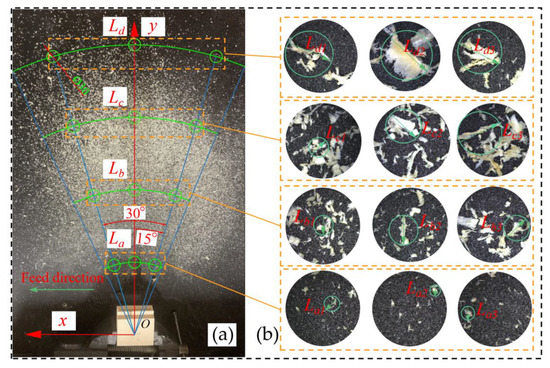 In the paper, a portable optical microscope (KR-W04, Chengdu Kenrei Technology Co., Ltd., Chengdu, China) was used to measure the wood chip size, as shown in Figure 3, which shows the top view of the chip scattering distribution during wood cutting in the No. 24 group of experiments. From the experiment results, it can be obtained that in the whole scattering area, as the distance with the wood block gradually increases, the density of scattered wood chips first increases and then decreases, and the wood chips also gradually increase. The center of gravity position of the wood is used as the axis to establish the x and y coordinate system, and the chip size is measured in the experiment according to the divided area. La to Ld area in Figure 3a is four equally spaced areas, each area consists of three measurement areas, and the diameter of the contour circle of the measurement area is 20 mm, in which four measurement areas are on the y-axis equally spaced arc, and the remaining measurement areas are on the arc with the y-axis as the symmetry axis into 15 symmetry. Figure 3b shows the three measurement areas corresponding to each region, and the chips in the measurement areas were photographed by a 1000 times portable optical microscope to obtain the results. The average value of the chip size in the measurement areas in each region was taken as the result value of the chip size in one region for each group of experiments, and the total average value was solved for each group of experiments in addition to the average value of the chip size in the four regions. La, Lb, Lc, and Ld denote the average of chip sizes in the four selected areas, and LA denotes the average of all chip sizes.