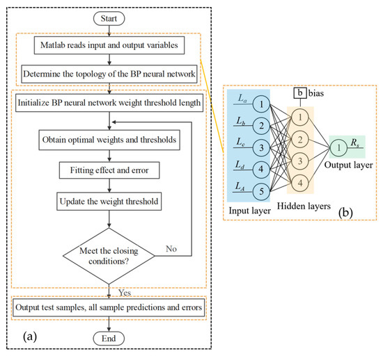 It is well known that chip size and surface roughness are affected by process parameters, and we have previously studied the effect of process parameters on chip size [28], and some scholars have successfully predicted the surface roughness of wood processing by establishing a wood surface roughness model under different process parameters through neural networks [25,29]. In this paper, surface roughness is predicted by chip size in the ANN model. The proposed ANN model is developed by using matlab neural network toolbox. The BP network is selected for prediction in the ANN model, and the BP network can learn and store a large number of input-output pattern mapping relationships without the need for known mathematical equations describing such mapping relationships. The flow chart of the ANN model prediction is shown in Figure 4. In Figure 4a, the BP network construction process is divided into three steps: BP network construction, BP network training, and experiment result output. BP network construction selects the sample input and output, determines the topology and main functions, BP network training initializes the weight threshold of the network, calculates the fitting error according to the characteristics of the input samples, and finally outputs the fitted and predicted values. Figure 4b shows the BP network topology, which mainly consists of the input layer, hidden layer, and output layer, with input samples as La, Lb, Lc, Ld, LA, and output samples as Rs.
